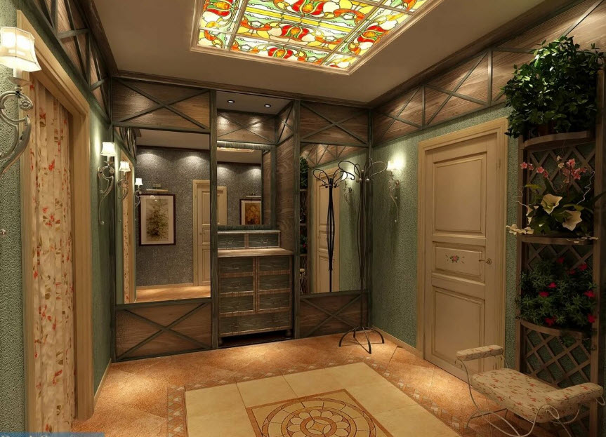 Характерными чертами кантри является дерево и обилие текстильных изделий с орнаментом. Для оформления прихожей с лестницей оптимально подойдет береза, ольха или сосна.