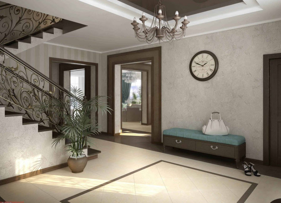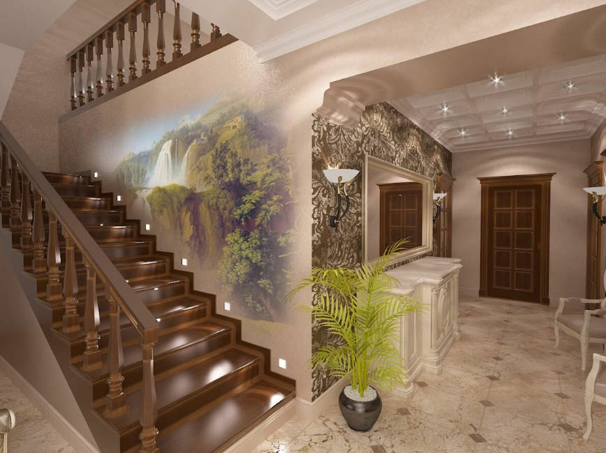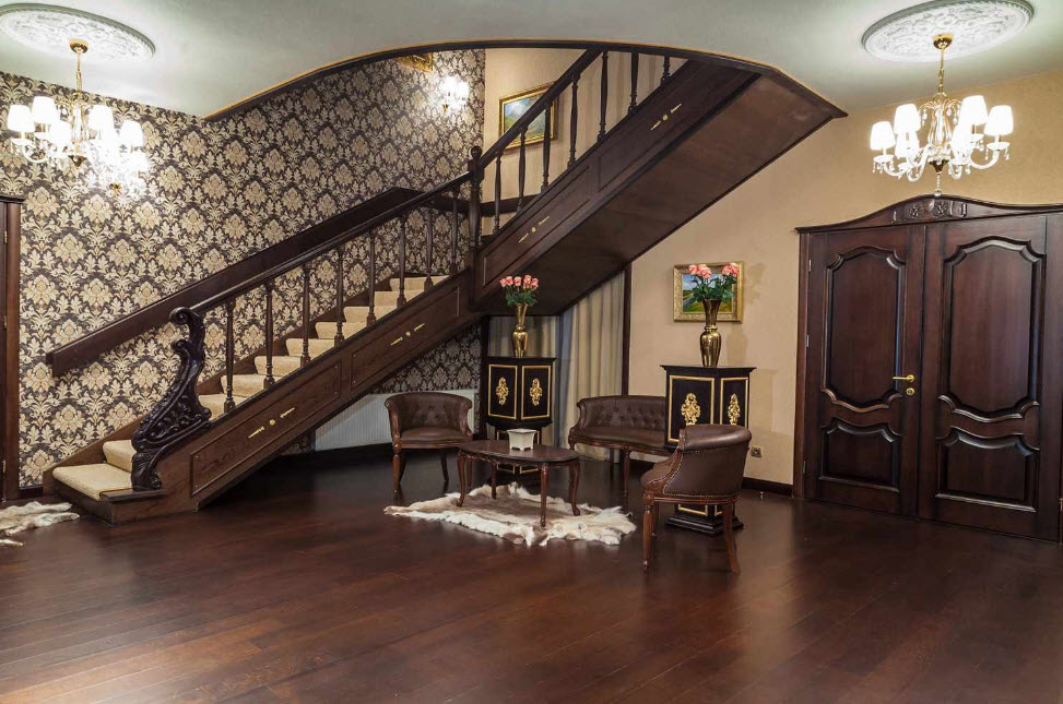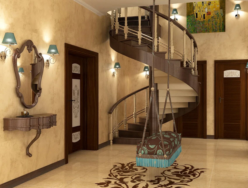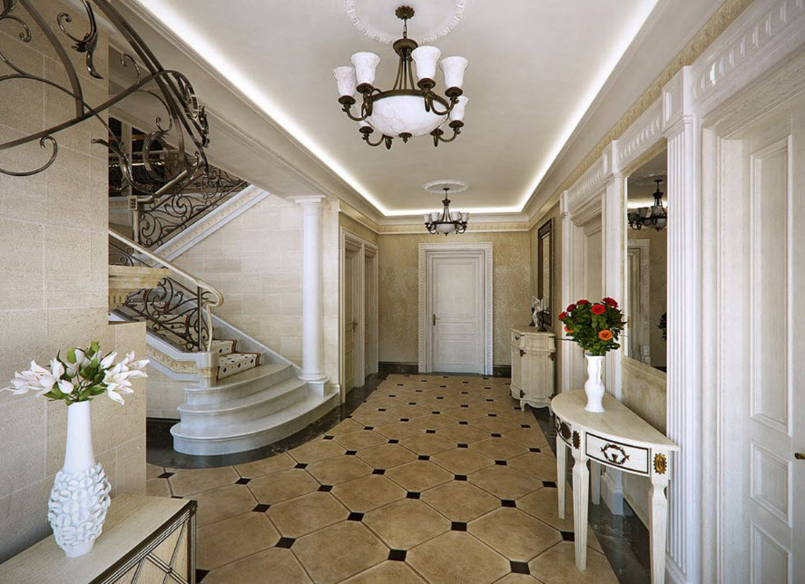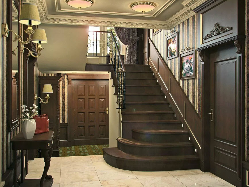 Классический интерьер выделяется строгими лаконичными формами и спокойной цветовой гаммой. Для стиля характерно наличие завитков, балясин и резных элементов. Не стоит перегружать холл лишними предметами, а в качестве мебели выбрать подходящие варианты: