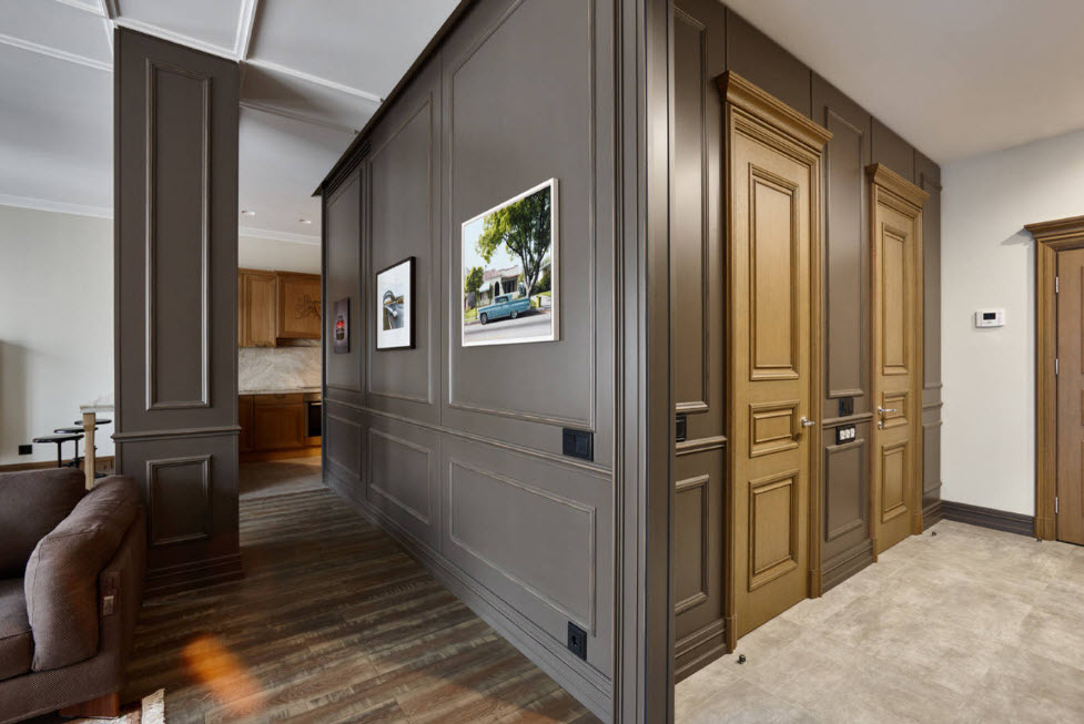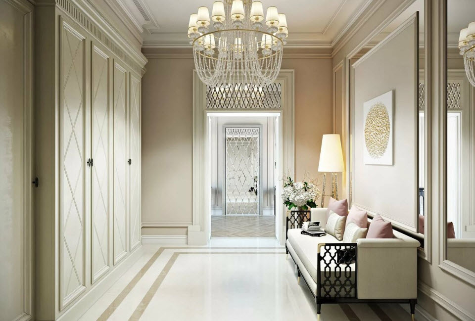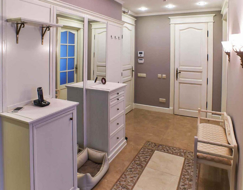 У больших коридоров проблема абсолютна противоположная. Если при обустройстве маленького пространства надо позаботиться о том, чтобы это самое пространство использовалось практично, то в просторном коридоре надо распределить мебель так, чтобы не осталось пустых блоков. Тут на помощь как раз приходит перепланировка гардероба.