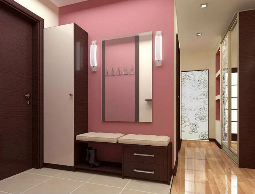 Если позволяет площадь, уместно поставить шкаф-купе. Часто встречающийся вариант – комбинированная корпусная конструкция, совмещающая в себе шкаф для верхней одежды, антресоли, полки для обуви, полки для аксессуаров, всевозможные ящички, нередко скамью. Не забываем о возможности размещения зеркал на дверцах шкафа. Удачным решением будет установить в конструкции подсветку под интерьер комнаты. Это и хороший дизайнерский ход, и дополнительный источник света.