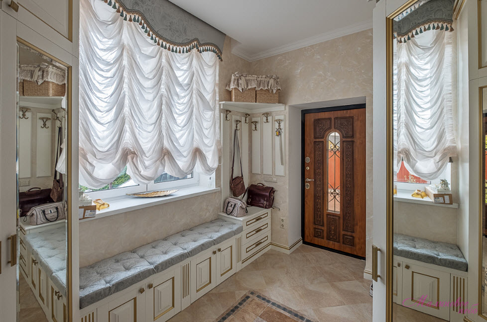 - При наличии окна в прихожей, его стоит оформить объемными портьерами.