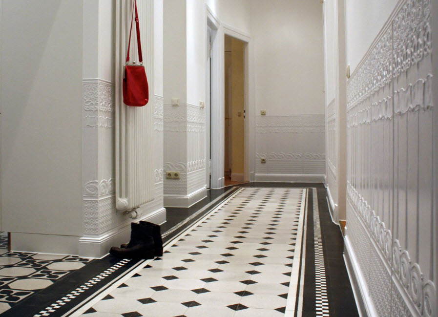 Для длинного коридора отлично пойдет разделение помещения на зоны. У входа можно поставить небольшой пуфик, несколько вешалок. Интересным вариантом будет установка многофункционального блока, где сразу будет место для сидения, место для обуви и т. д.