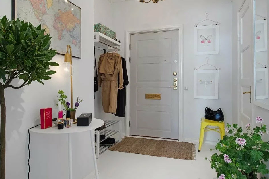 Размещение на стенах подвесных полок – неплохое решения для интерьера. Они могут понадобиться для каких-то мелочей, украшений, сувениров, косметики, ключей и прочего. Для этих же целей можно поставить маленький столик. Помимо всего прочего, на нём прекрасно устроится стационарный телефон.