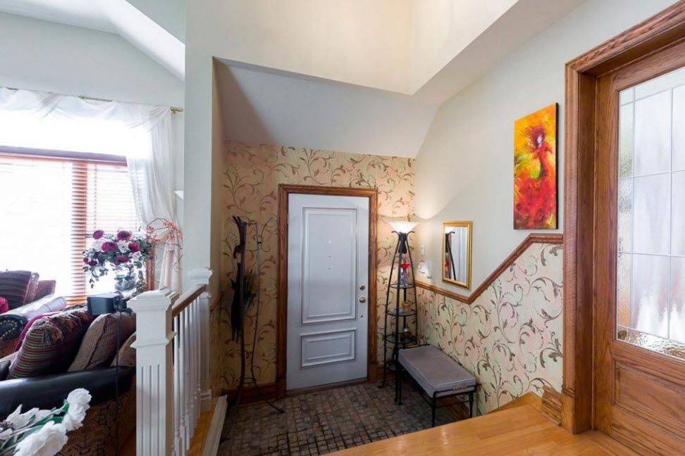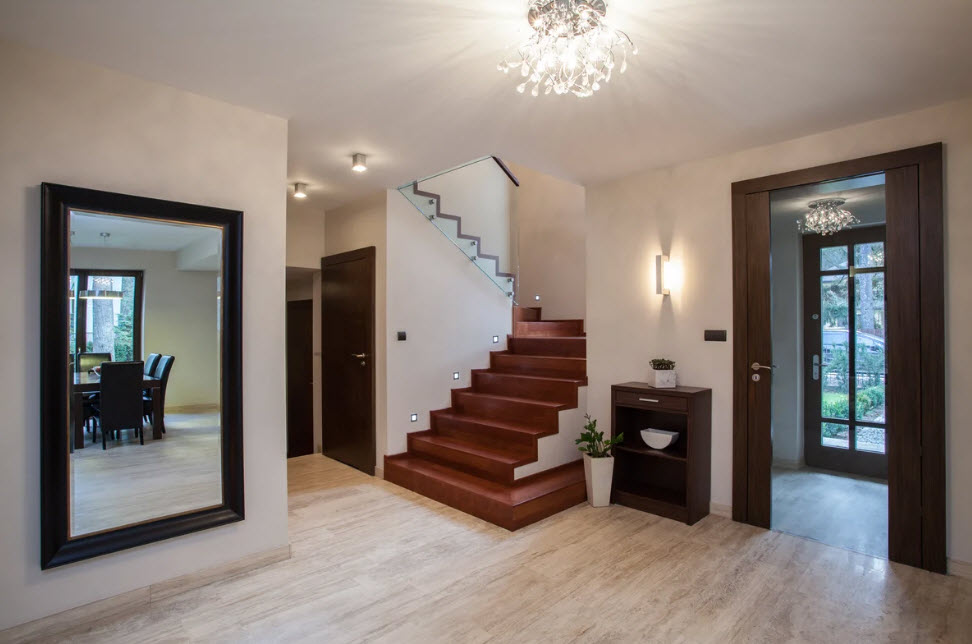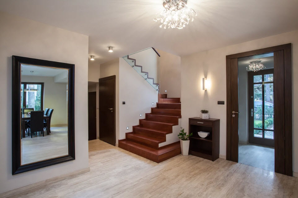 В частных строениях размеры и высота прихожих позволяют создавать интересные и запоминающиеся проекты
