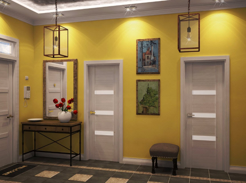 В большинстве случаев прихожая не имеет окон, следовательно, солнечные лучи сюда не проникают. Для того чтобы помещение не было серым и мрачным необходимо позаботиться о хорошем освещении, выбор которого зависит от размеров комнаты и ее планировки: