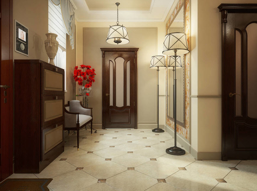 Классика в оформлении прихожей не теряет своей актуальности и является самым востребованным направлением. Это объясняется использованием дорогих древесных пород и камня.