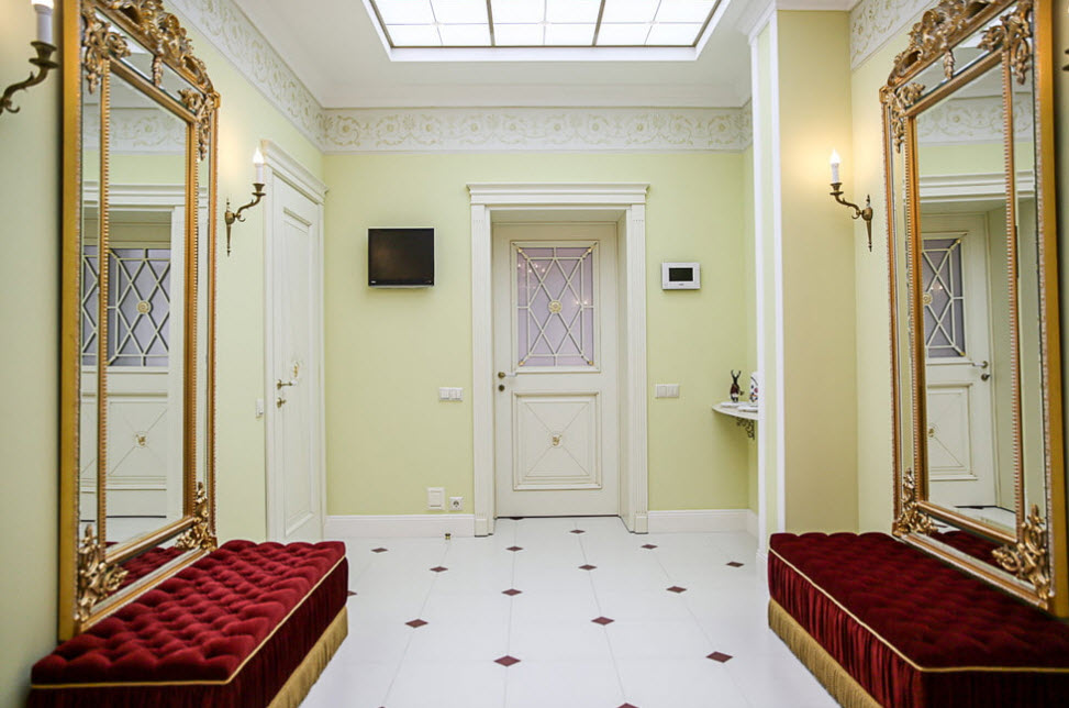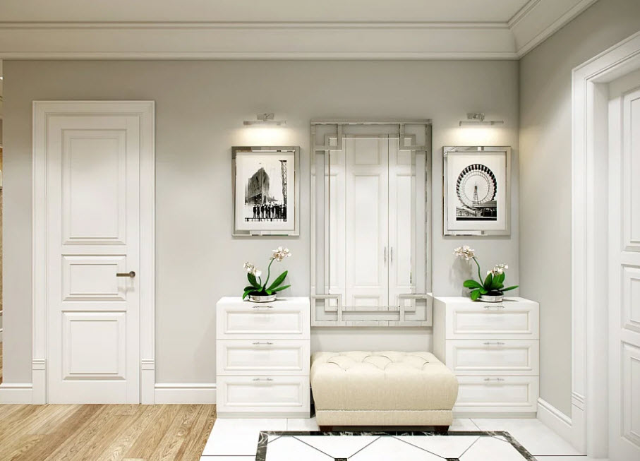 Пуфы для сидения, лаконичный шкаф для верхней одежды и зеркало в полный рост – вот три необходимых элемента в любой прихожей, даже очень просторной.