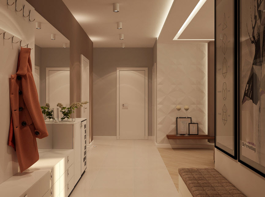 - Прихожая, разделенная на функциональные зоны – два источника света с разной интенсивностью или оттенком (основной и дополнительный).