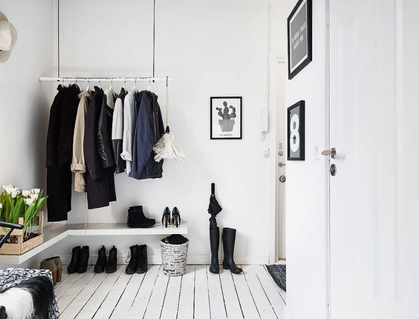 Если в прихожей имеется кладовая, то её можно превратить в удобную гардеробную комнату, удачно сэкономив место в прихожей.