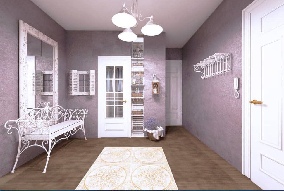 Деревянные или кованые предметы мебели белого цвета с эффектом старины оптимально впишутся в прихожую в стиле прованс. Аксессуары в виде подставки для зонтов, вешалки или зеркала в рамке дополнят общую картину помещения.