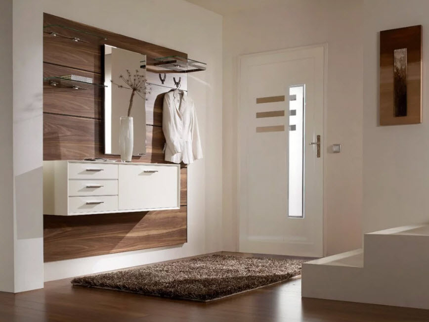 Отражение поверхностей друг от друга сыграет вам на руку. Допустимо, чтобы мебель контрастировала с остальной частью комнаты. Старайтесь, чтобы у входной двери ничего не стояло, особенно если она открывается внутрь квартиры. Помните также, что глубина шкафа, комода или тумбы не должна превышать 40 см.