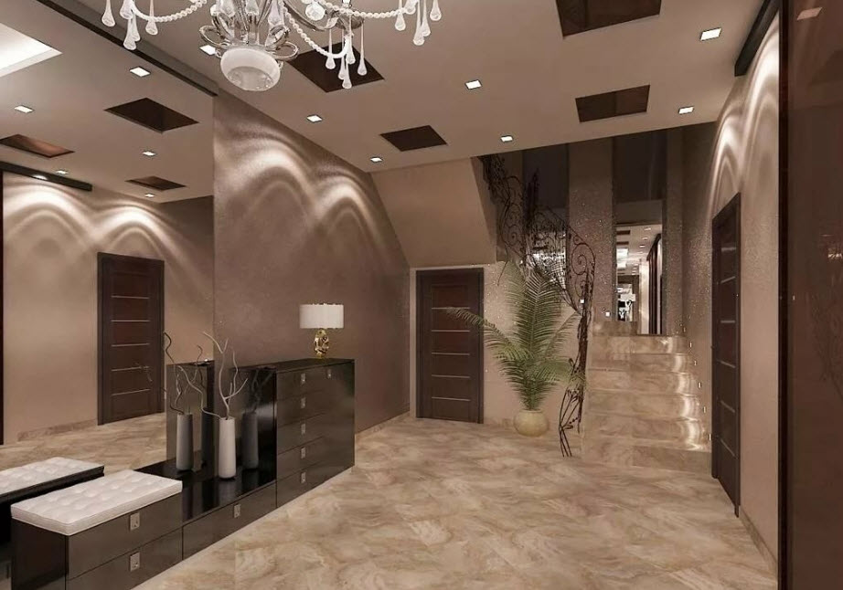 - Большая прихожая – центральная люстра и точечная подсветка по периметру.