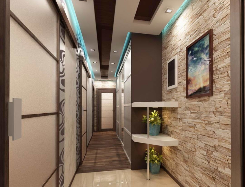 Так как пространство узкое, не стоит использовать отделку темных цветов – они зрительно уменьшают помещение, особенно при отсутствии естественного освещения. Также имеет значение, где располагается коридор, исходя из этого нужно учитывать некоторые нюансы.