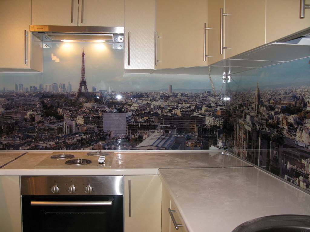 Это может быть красивый принт стеклянного фартука, отделка рваный кирпич, имитация древесины дорогой породы.