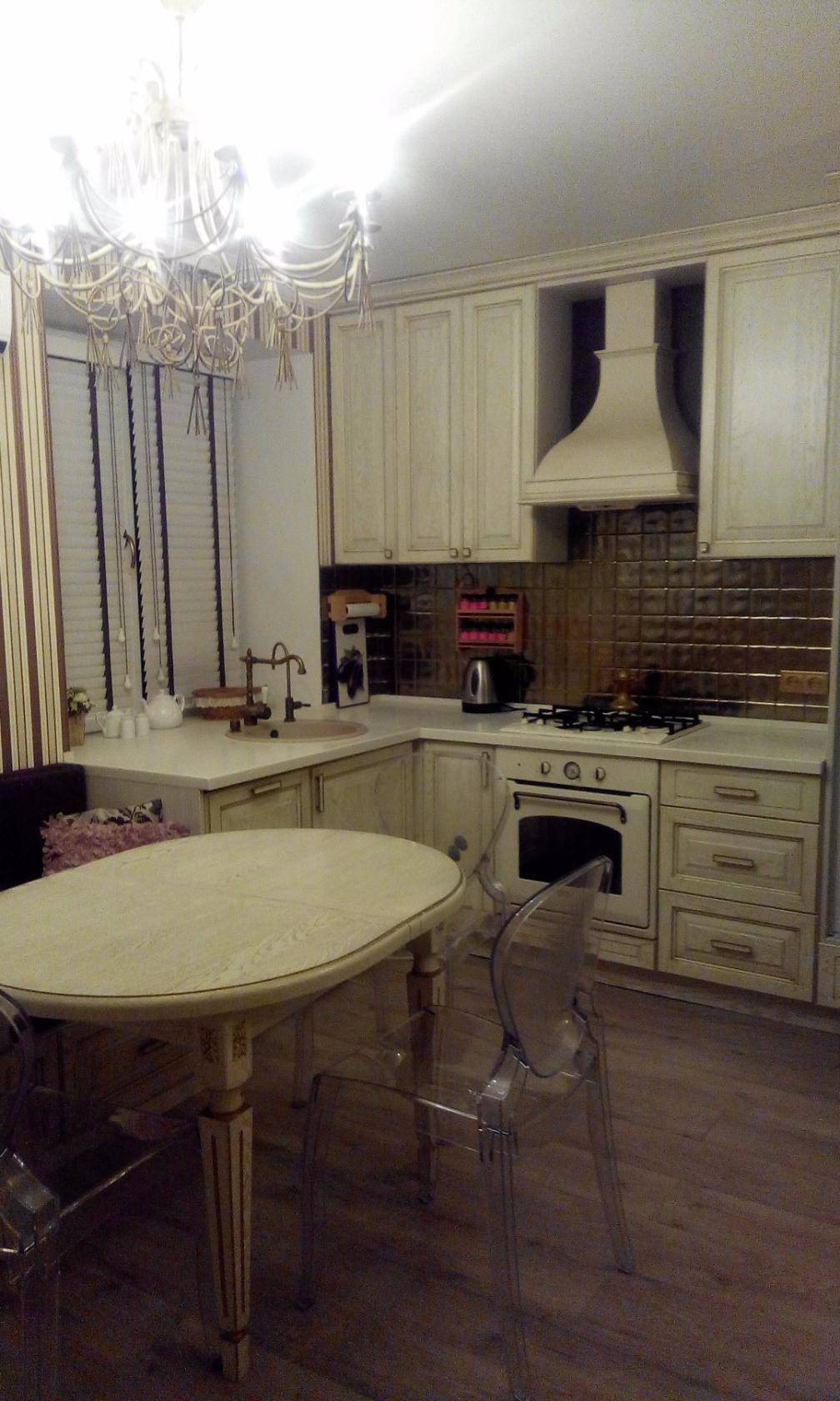 Если это невозможно, то можно максимально разгрузить пространство, используя светлые тона обоев и плитки, установив большое пластиковое окно и стеклянные, либо арочные двери. Обеденная зона в данном случае выносится за пределы кухни, например, в гостиную.