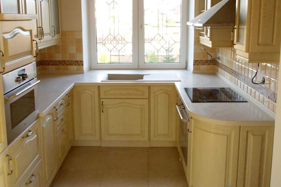 Огромные массивные гарнитуры из дорогого дерева, позолота, тяжелая каменная столешница, темный объемный текстиль – все это нелепо смотрится на маленькой кухне. А вот рационализированные и облегченные элементы будут очень уместны.