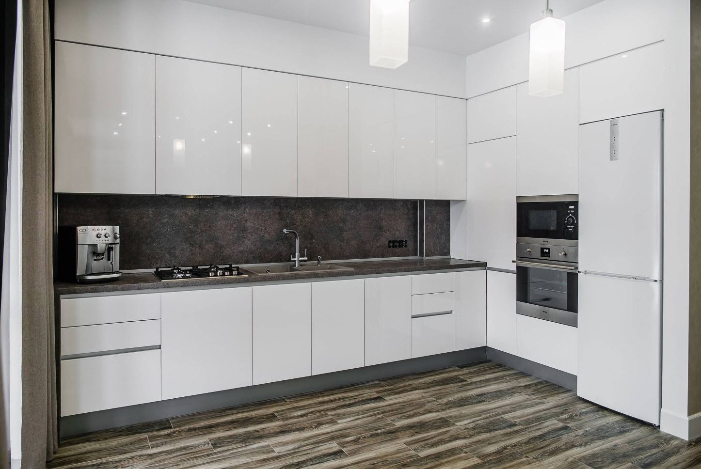 Так, например, идеально смотрится в современном дизайне варочная поверхность со встроенным духовым шкафом, рядом с которым можно разместить вместительные модульные шкафы