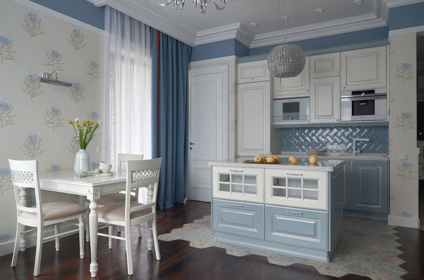 Светлые цвета подходят для закрытой небольшой кухни, потому что они оптически увеличивают ее. Однако вам не нужно полностью отказаться от насыщенного тона. Стоит рассмотреть кухню 8 кв. м синего цвета! Когда помещение для приготовления пищи открыто для гостиной, то у вас есть две идеи для небольшой кухни. Первая — вы можете комбинировать композицию с остальной частью помещения, второе решение — вы также можете «отрезать» расположение небольшой кухни от гостиной. Что это значит? Например, гостиная оформлена бежевым и светло-коричневым или серым, а небольшая кухня только в белом. Помните, что гостиная более важна во всей композиции, поэтому небольшая зона для приготовления пищи должна иметь немного приглушенные цвета.