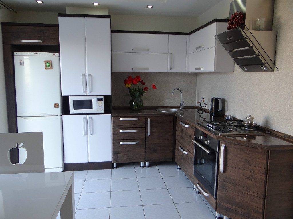 Угловая (буквой «Г») расстановка отличается особой практичностью и универсальностью. Такой вариант подходит практически для всех кухонь в 9 кв. м и около того. Полученный в итоге интерьер наиболее оптимально задействует имеющееся пространство и углы в комнате. При этом остается еще масса места для обеденного стола и/или мягкого уголка вместо стульев.