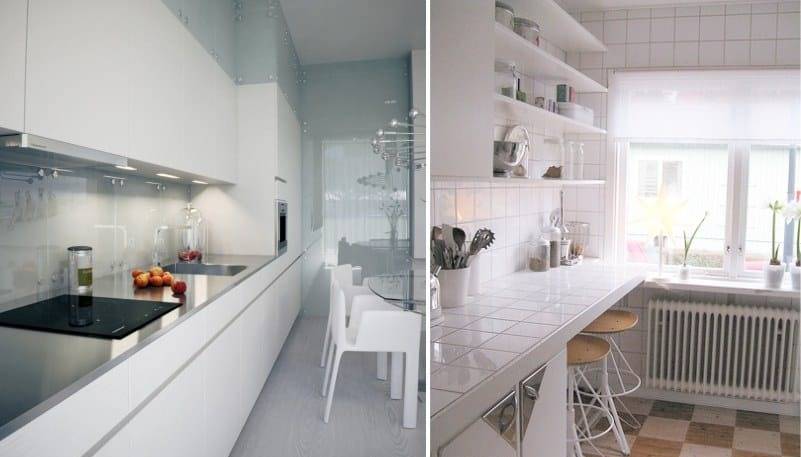 По периметру трех стен удобно впишется кухонная мебель и техника. А если площадь имеет форму квадрата, то будут заняты даже углы. Для удлиненной формы, больше похожей на прямоугольник, идеальным будет следующее решение: одну стену заставить холодильником и встроенной техникой, а параллельная ей будет оформлена под обеденную зону.