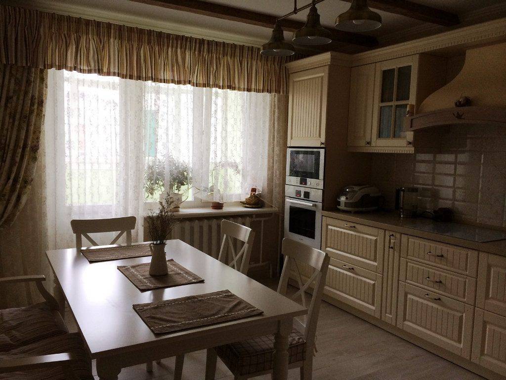 - Оформление полностью в светлых тонах. Кухонный гарнитур может гармонировать с цветом стен при условии, что выбрана нейтральная гамма. Это может быть бежевый, молочный, персиковый, светло-зелёный. Для помещений с хорошей освещенностью, окна которых выходят на солнечную сторону, можно выбирать холодные оттенки, например, сиреневый или бледно-голубой.