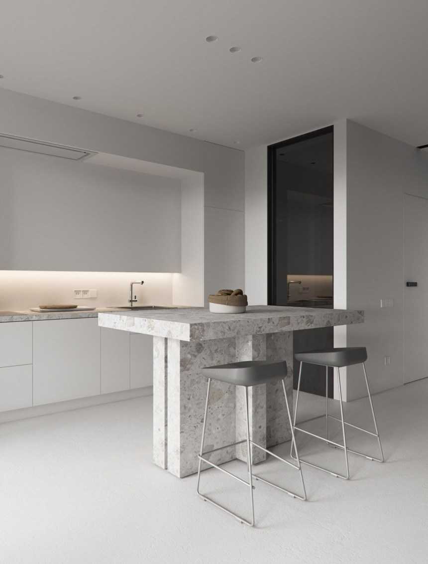 Мыслите шире. Не обязательно ставить огромный обеденный стол. Сэкономит место барная стойка, вдобавок низ которой можно использовать для хранения кухонной утвари.