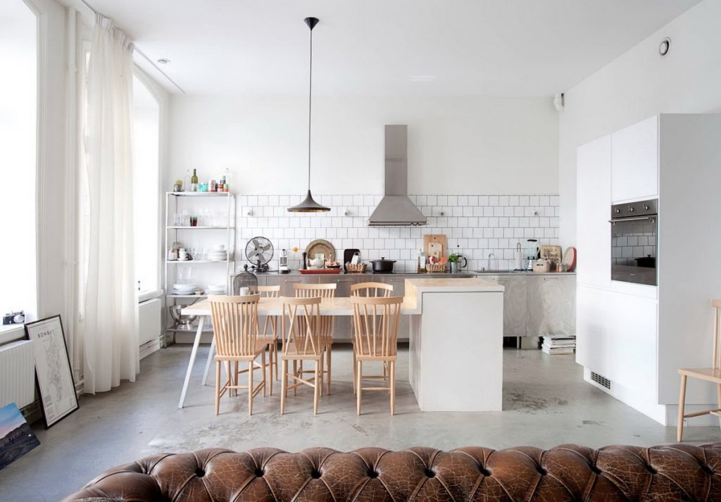 Отказ от верхних шкафов можно считать и демонстрацией несогласия с привычными шаблонами, и смелой заявкой на расширение границ. Эта идея как нельзя лучше вписывается в философию стиля лофт, делающего ставку на максимум свободного пространства и суровые промышленные мотивы в интерьере.