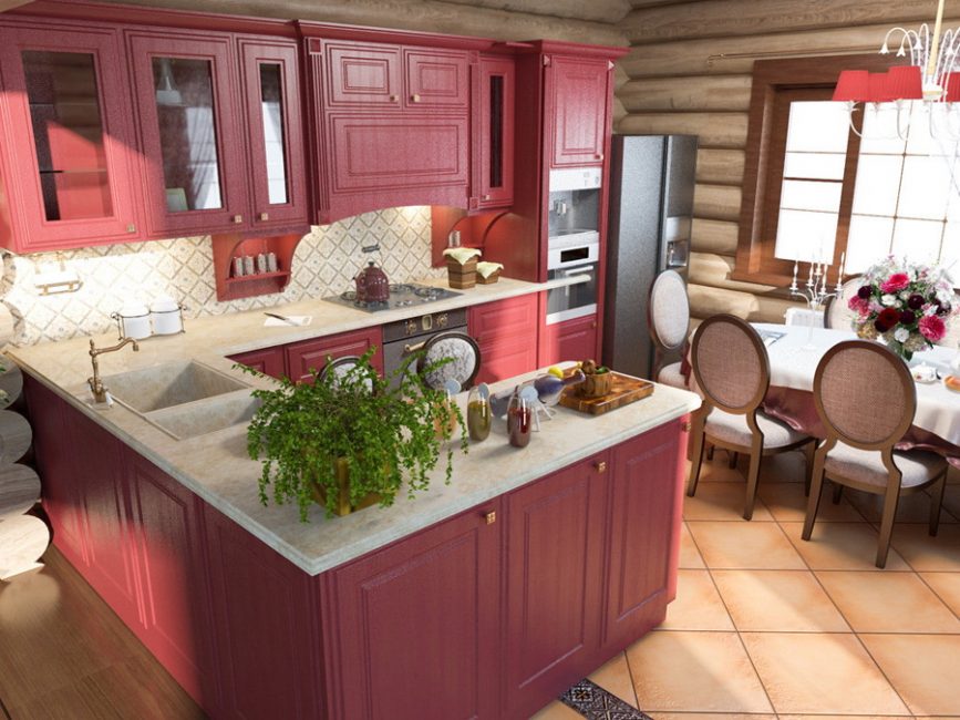 Романтизм прованса больше подходит для загородных домов. В таком помещении можно использовать винтажный гарнитур, на потолке разместить деревянные балки, а зону готовки украсить камином. В гостевой части располагают мягкий уголок с обивкой в мелкий цветочек. А в центре комнаты установить большой обеденный стол с красивой скатертью ручной работы.