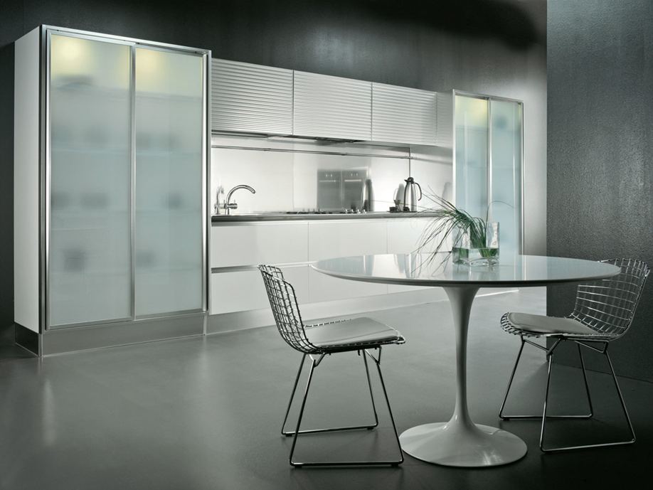 Хромированные элементы. Речь идет не только о коммуникациях (краны, смесители, мойки), но и о предметах декора. В модерновые стили отлично вписываются столешницы, подставки под цветы, полки и изящные столики с ножками из хрома.