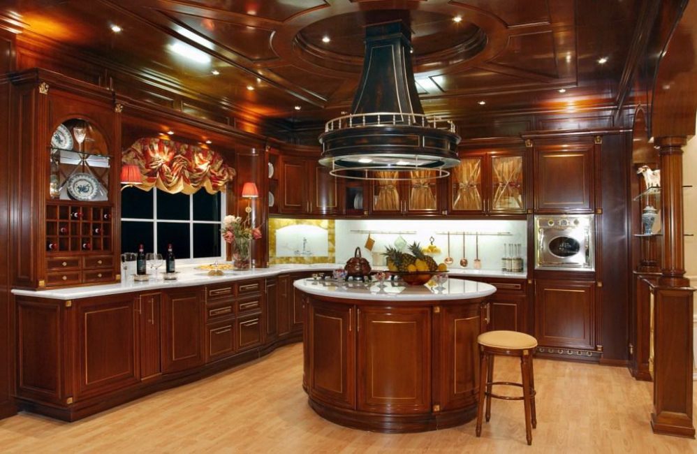 В просторной кухне заполнение трех стен не будет выглядеть давяще при грамотной расстановке, подборе цветовой гаммы и стиля помещения.
