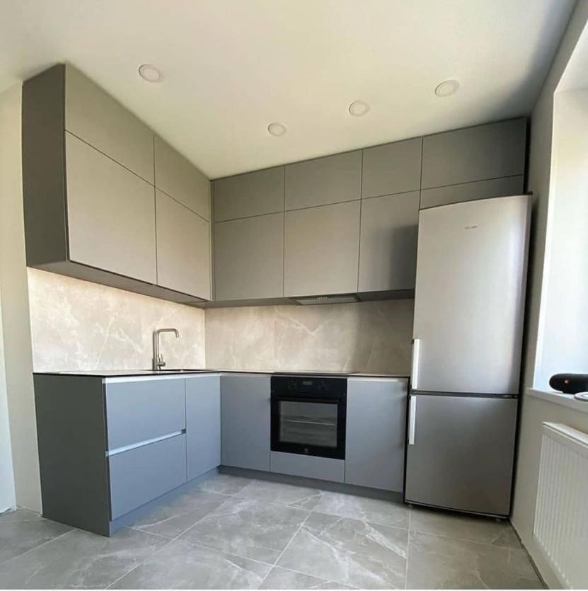 Шлифованное белое – уже сероватое. У серого имеется замечательное свойство сочетаться с немыслимо яркими цветами. Оливковый стол, ультрамариновая столешница зоны готовки, небесно-голубые полки. Серая кухня идеально сочетается с мельхиоровой фурнитурой, хрусталём, зеркальными фасетированными плитками на стене. В сером – по-царски, совсем не уныло. Подробнее…
