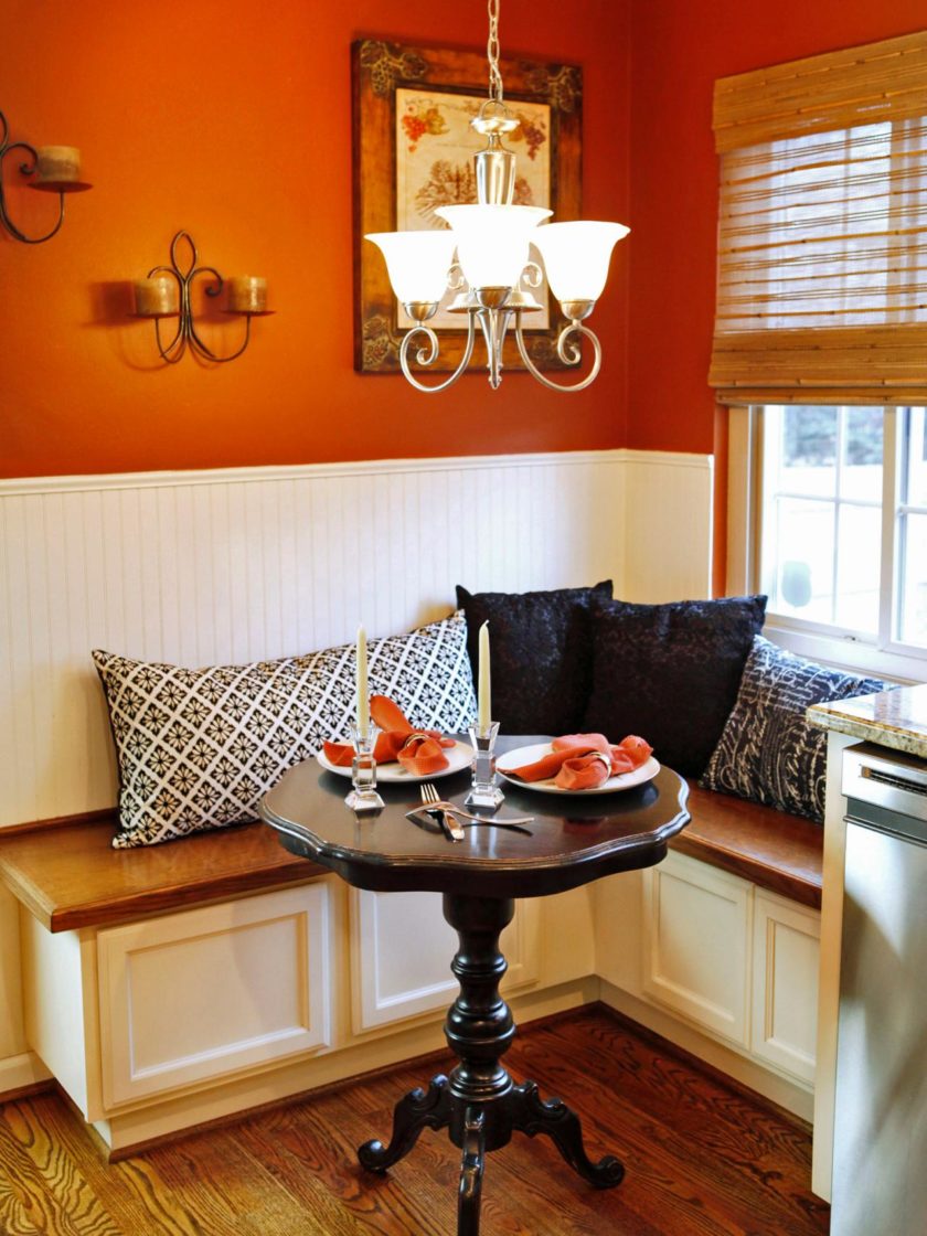 Часть кухни, где размещается мягкая мебель, может быть выделена цветом и отделочным материалом – стены в этой части можно оклеить обоями, контрастного цвета или рисунка.