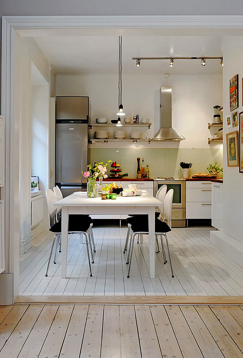 Добавь в интерьер своей кухни как можно больше белого цвета. Причем это касается не только отделочных материалов, но и кухонного гарнитура. Сейчас даже полы оформляют в светлой палитре. Это отличный прием для небольших помещений: белые плоскости, переходящие одна в другую, не имеют границ, что визуально расширяет пространство.