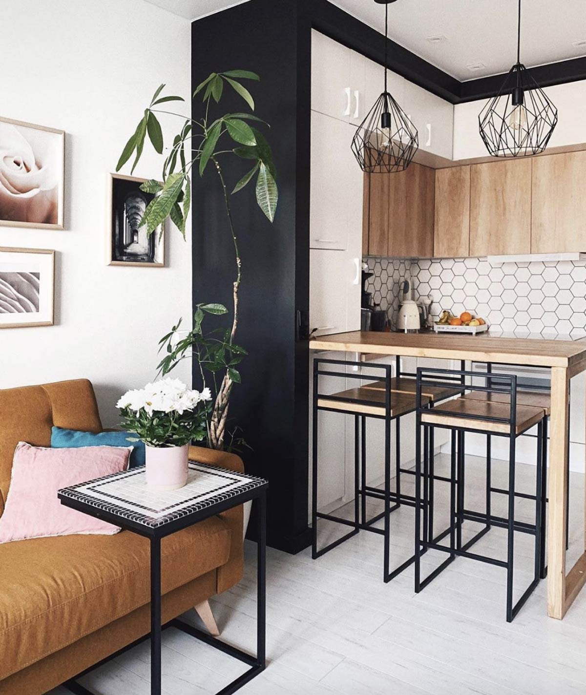 Маленькая кухня требует хорошего дизайна. Функциональность — это то, что имеет значение здесь. Хороший способ увеличить интерьер небольшой комнаты для приготовления пищи — соединить ее с гостиной. Дизайн кухни стоит начинать с планировки. В маленькую кухню следует подобрать мебель, которая имеет несколько функций. Полуостров отлично справится с обустройством комнаты. Доказано, что он является отличным решением для небольших площадей. Позволяет максимально использовать поверхность небольшой комнаты, занимая мало места, поэтому вы можете удобно приготовить еду и съесть ее вместе. В свою очередь, пространство под полуостровом будет полезно для хранения кухонных безделушек и монтажа розетки.