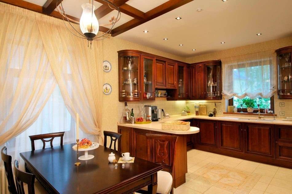Шикарная портьера или тюль гармонично вольётся в классическую кухню. Даже в домах, построенных после войны, такое решение будет изысканным, оригинальным.