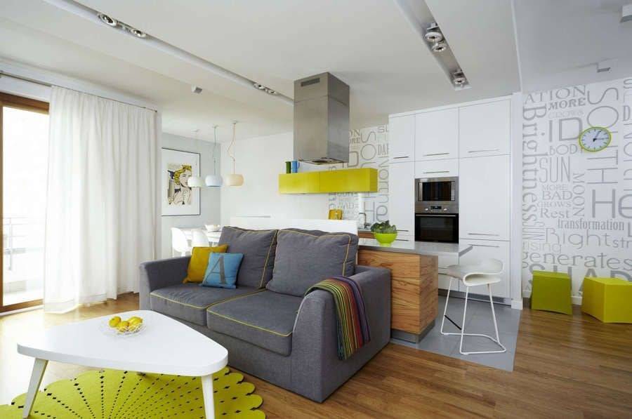 Гармоничная кухня-гостиная: студия 25 кв. м с визуальным разделением пространства