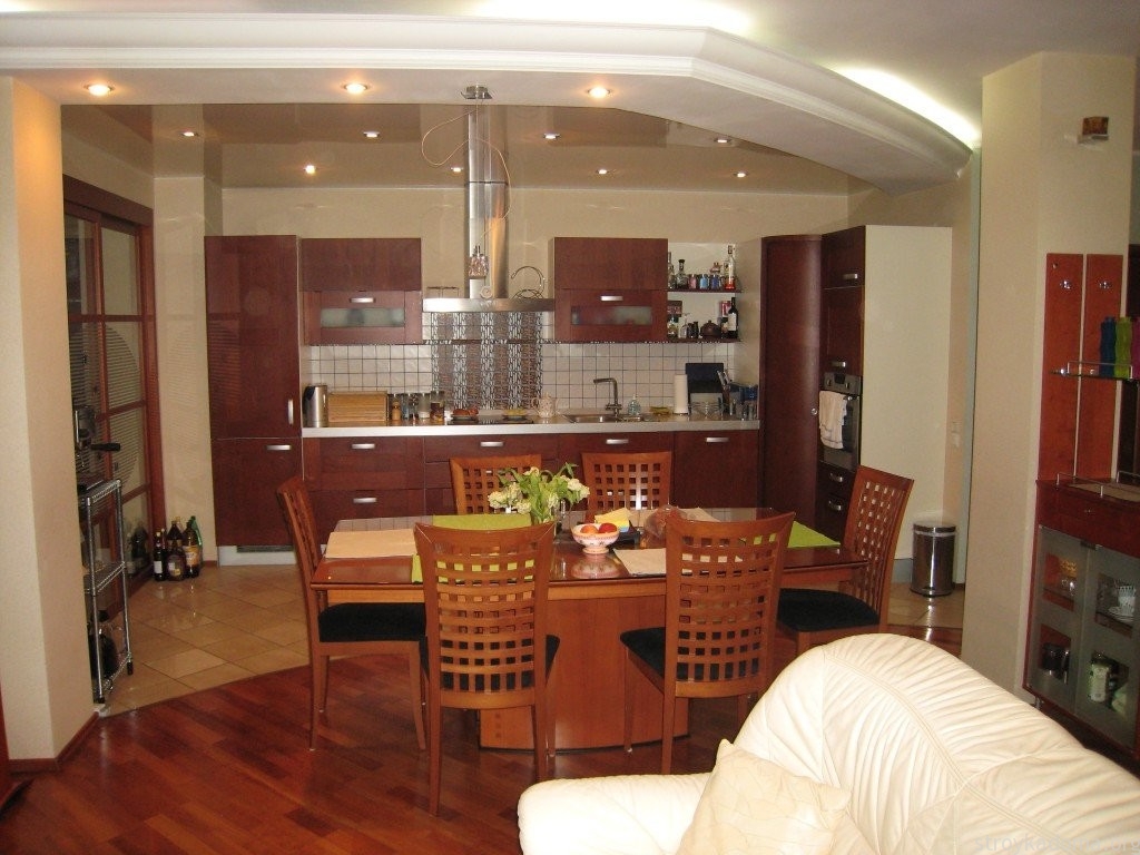 Зонирование кухни-столовой и гостиной можно осуществить с помощью большого обеденного стола на границе гостиной и кухни. Он разделит и упорядочит пространство. Эффектно смотрятся размещённые над толом низко висящие светильники. Светильники лучше выбирать теплых тонов, так еда на столе будет казаться аппетитней.