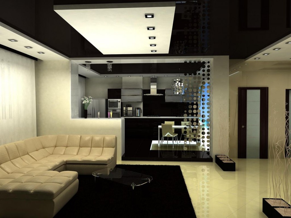 Визуальное разделение. Оно дает возможность выделить отдельные зоны с помощью их выноса на подиум, расположенный выше уровня пола, а также световых эффектов, разной (но соответствующей единому стилю) отделки стен, установки многоуровневых потолков.