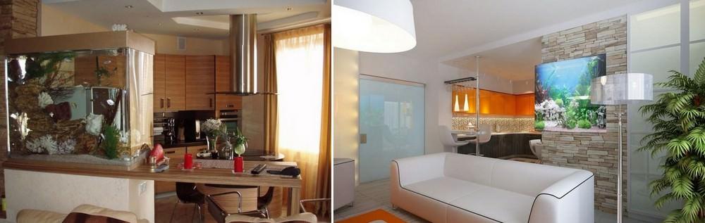 Совмещенный дизайн помогут оживить представители флоры и фауны, расположенные на стыке зон. Аквариум с экзотическими рыбами, перегородки из живых цветов придадут действительно неповторимый колорит всему помещению и сделают отдых приятным и умиротворяющим