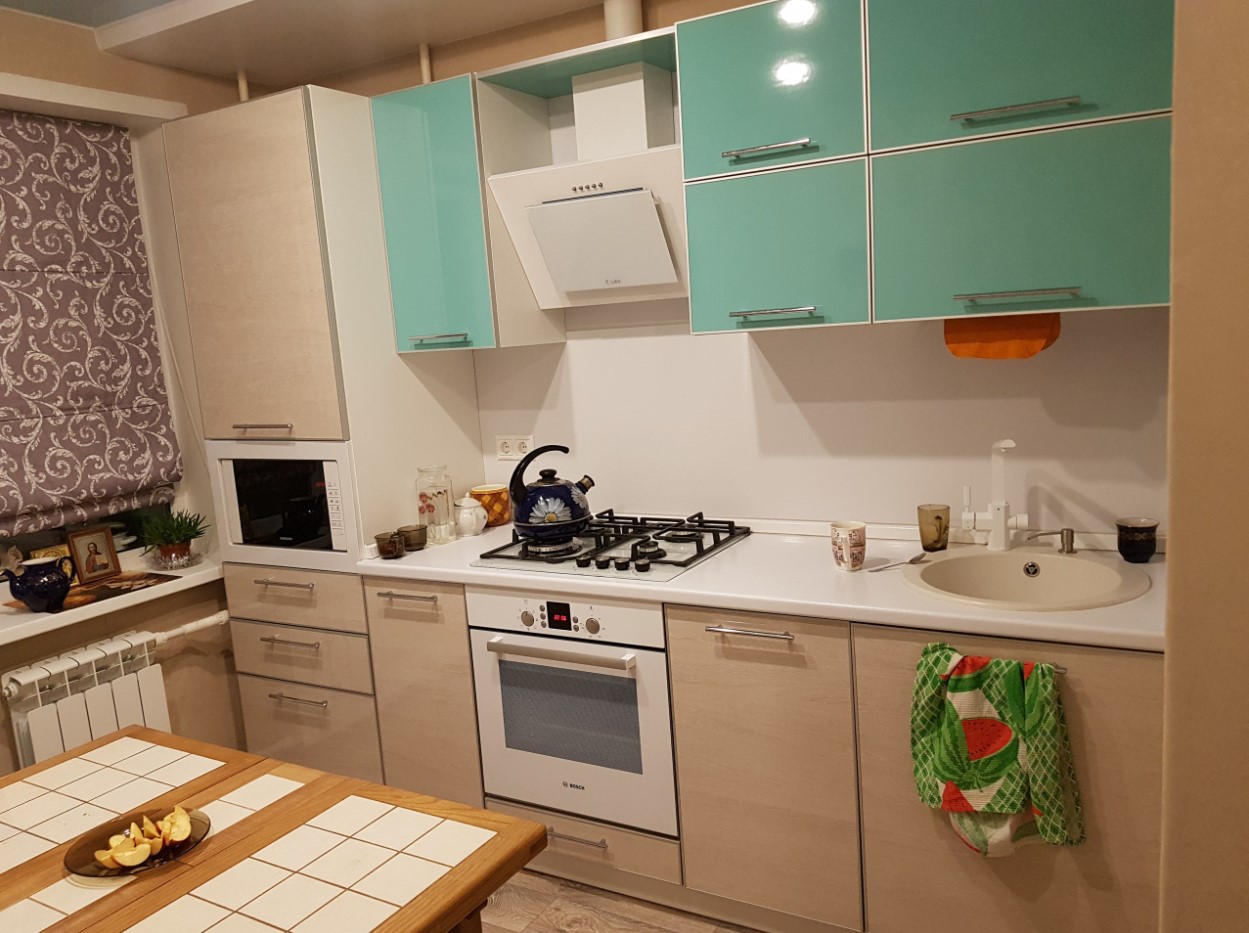 Часто можно встретить именно зеленый (либо салатовый, мятный) гарнитур на фоне светло-бежевых стен.