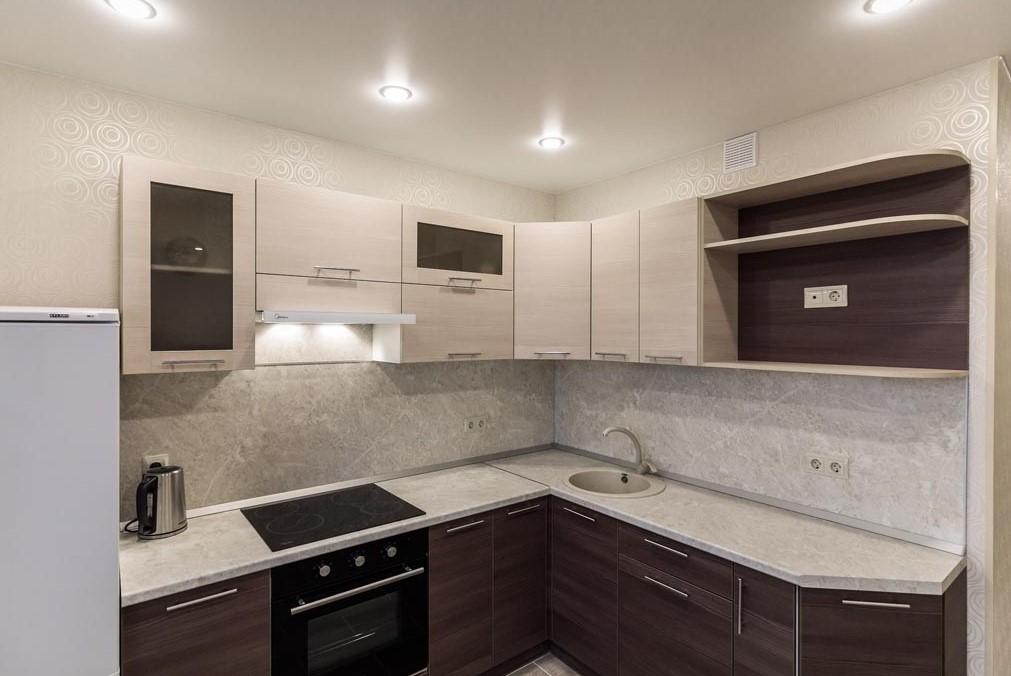 Попробуйте оформить стены в светлой бежевой гамме (покрасьте или поклейте обои), подберите белоснежный гарнитур и разбавьте эту композицию фартуком, напольным покрытием и столешницей в шоколадных тонах с холодным отливом.