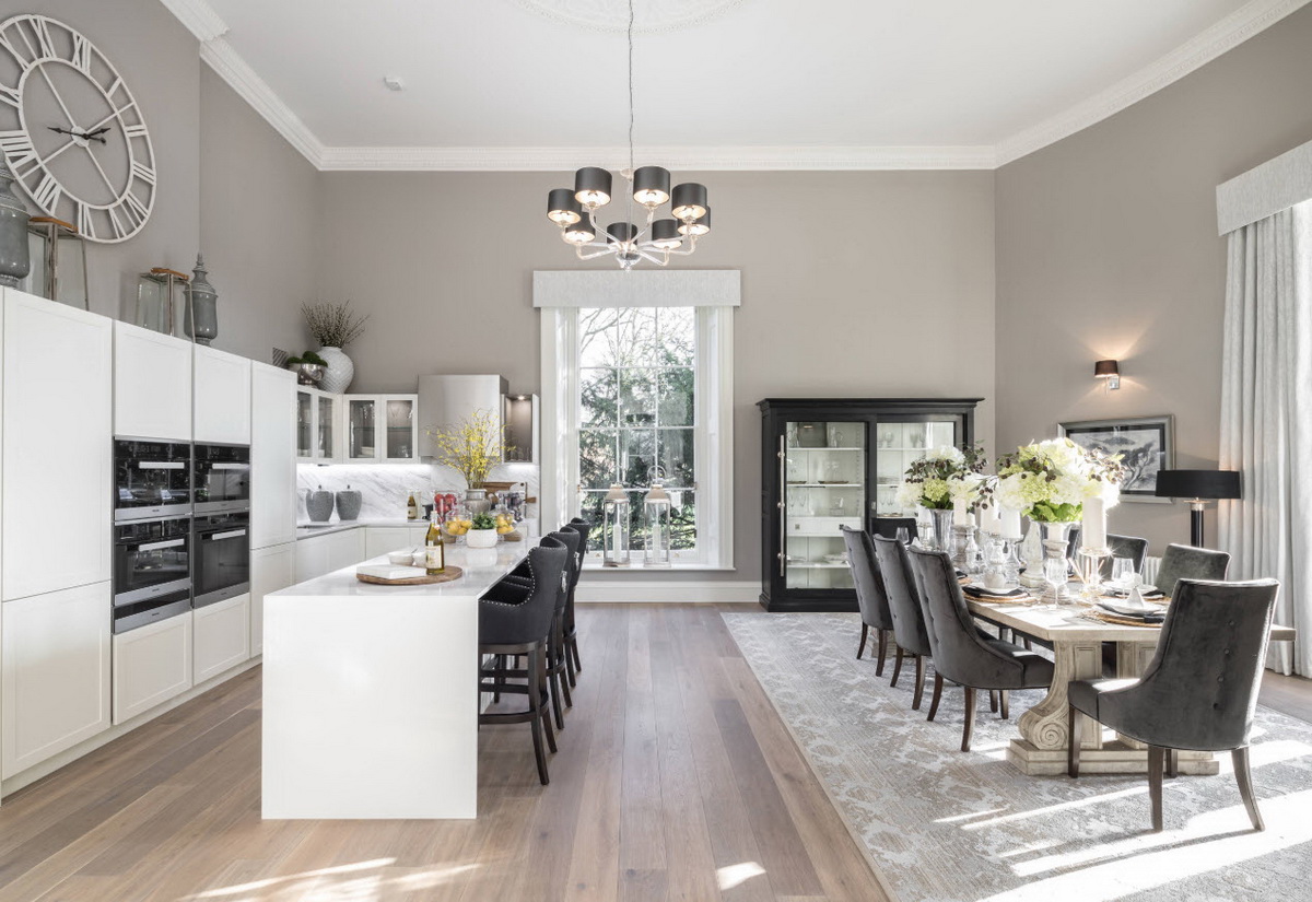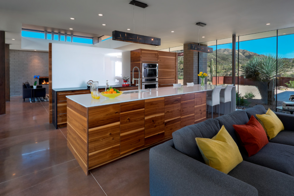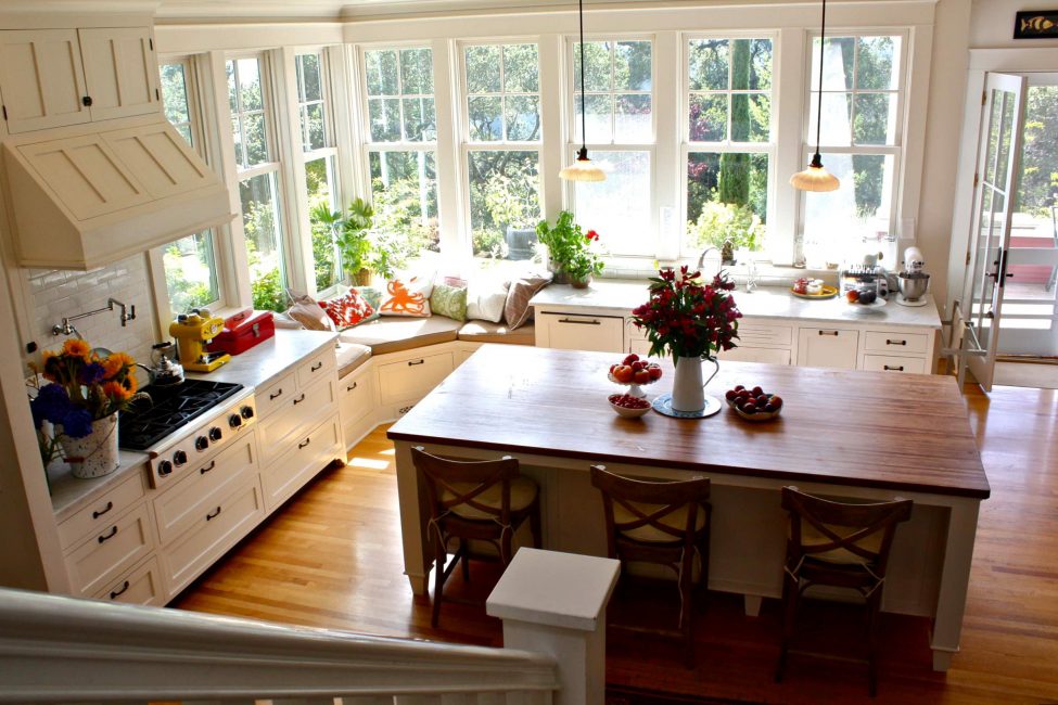 Дом имеет свои преимущества – немалый простор. Есть возможность организовать пространство с панорамными окнами и выходом в сад. А внутри создать несколько функциональных зон: кухню, обеденную зону и зону отдыха. Своеобразным отделяющим барьером между кухней и мягкой зоной отдыха станет барная стойка. Свет и ощущение свежести, обилия воздуха в пространстве обеспечат панорамные окна с видом на сад.