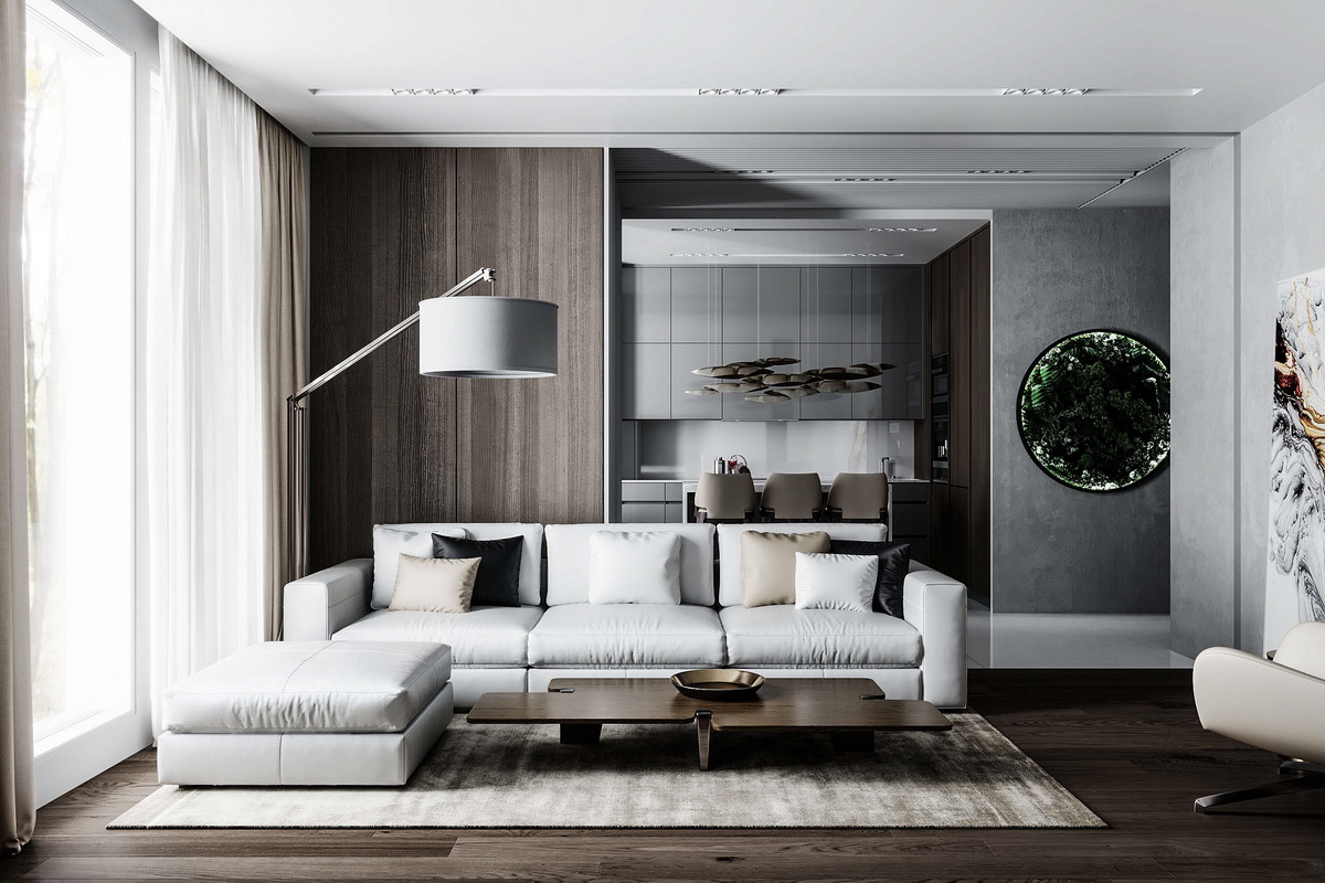 Любителям больших светлых пространств идеально подходит кухня-гостиная. А чтобы сделать это ощущение воздушности и простора максимальным, используйте для оформления стен светлые или даже белые оттенки, а яркости добавляйте цветовыми акцентами. В качестве цветовых акцентов может выступать мебель, оконный текстиль, отдельные элементы декора или даже светильники. Они разбавят обилие белого цвета и не позволят стать интерьеру скучным.
