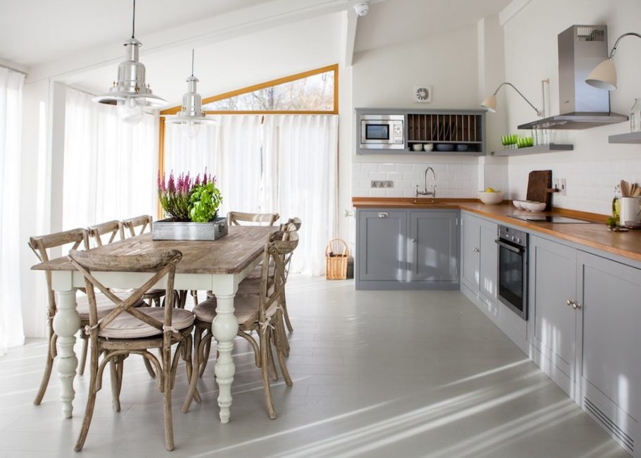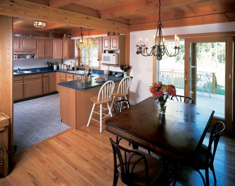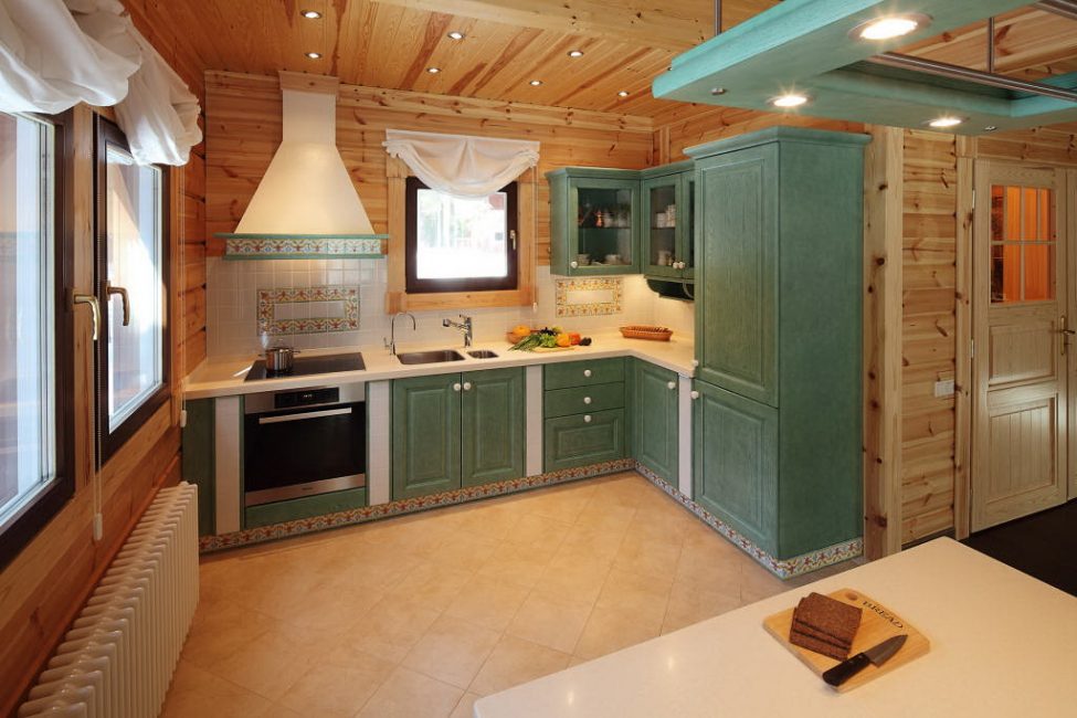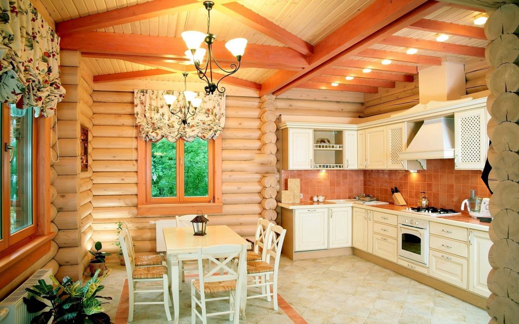 Для отделки кухни на даче, коттедже существует гораздо больше возможностей, чем в типовой квартире. Этому способствуют высота, площадь, нестандартная геометрия помещения. Выполнить отделку в деревянном доме проще. Сразу после постройки здания она сводится к минимуму, для начала нужно только облагородить поверхность пола, стен, потолочных несущих конструкций.