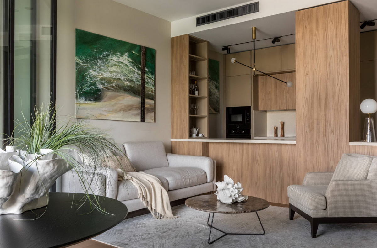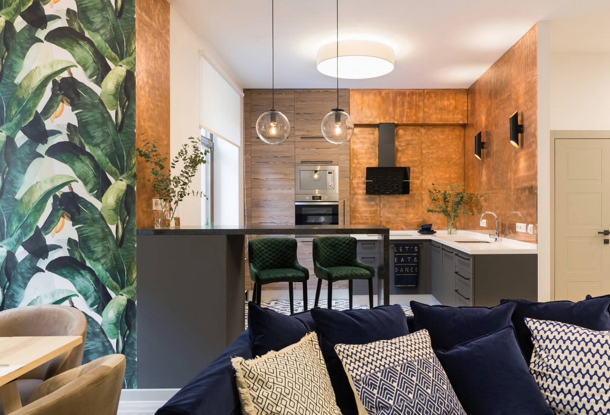 Если у вас студия, то остается лишь создать комфорт и обеспечить функциональность в зоне кухни-гостиной. Рекомендуем использовать натуральные материалы в теплых тонах. Натуральность – тренд последних нескольких лет. Натуральные материалы наполнят помещение «теплом», создавая особую атмосферу комфорта.