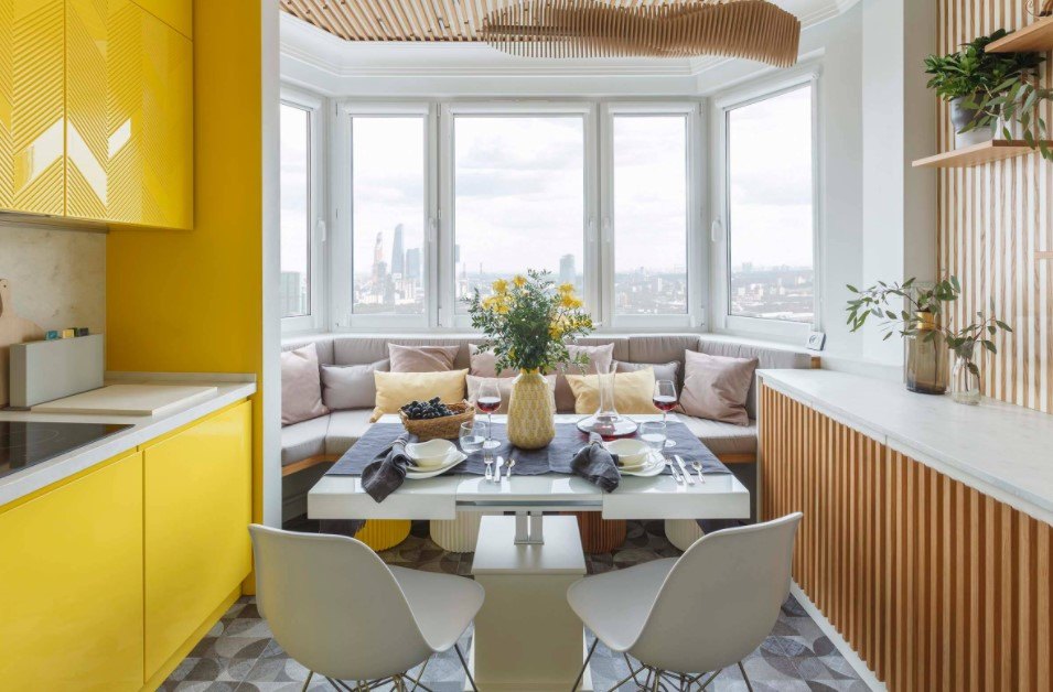 Во втором варианте перепланировки между кухней и балконом обустраивается перегородка в виде вместительного комода, «острова» или барной стойки, которые в большинстве примеров разделяют общую квадратуру на функциональные зоны.