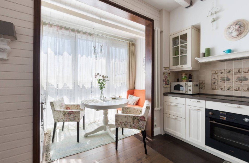 Когда речь заходит о создании кухонного интерьера с непосредственным задействованием прилегающего к основной комнате балкона, специалисты советуют отталкиваться от трёх основных способов перепланировки. В первом случае рассматривается идея разделения кухни и балкона. Оба помещения оформляются в одном стиле, колористике и отделяются друг от друга при помощи окна и двери. На «бывшем» балконе в подобном примере можно организовать удобные места для хранения консервации, например, обустроить место для отдыха или создать личный кабинет.