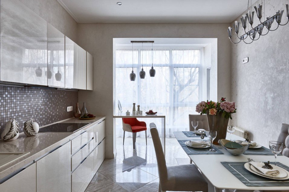 - Благодаря увеличенному пространству, в совмещенную зону можно поместить массивную мебель и различную кухонную технику.
