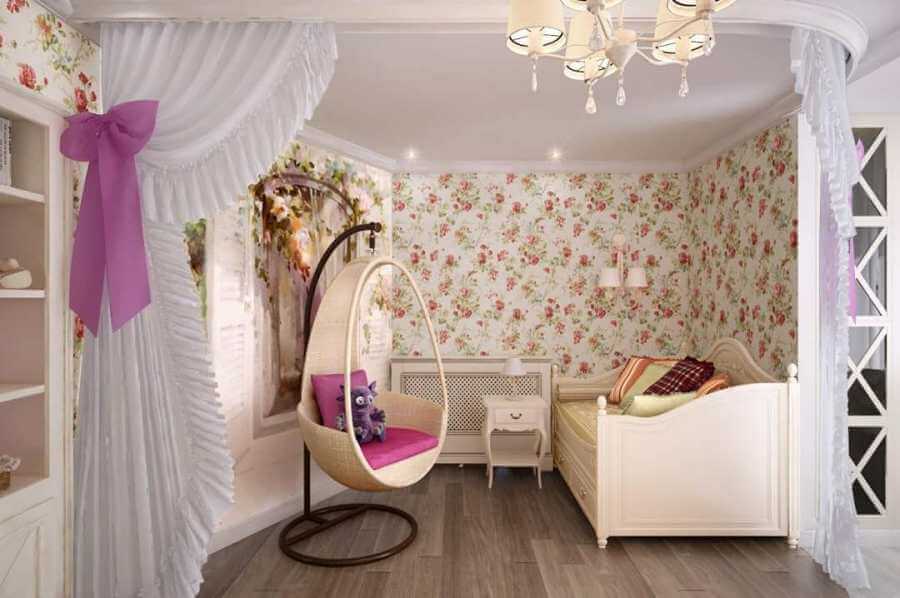 При выборе подходящей люстры лучше остановить свой выбор на фонарях, абажурах, выполненных из ткани, хорошо было бы подобрать рисунок аналогичный принтам на стене или мотивам на оконном текстиле.