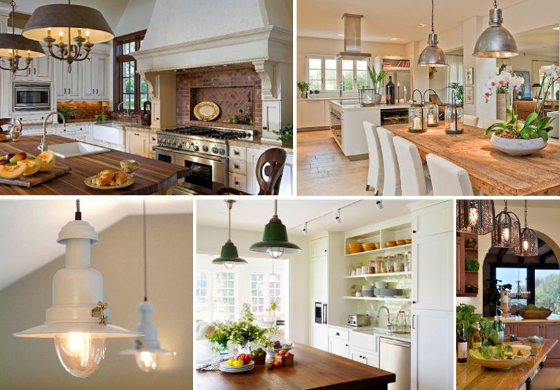 Бра и точечные светильники для классического воплощения этого стиля не приемлемы, хотя их все чаще можно увидеть в современных интерпретациях кухонь в Кантри-стиле.